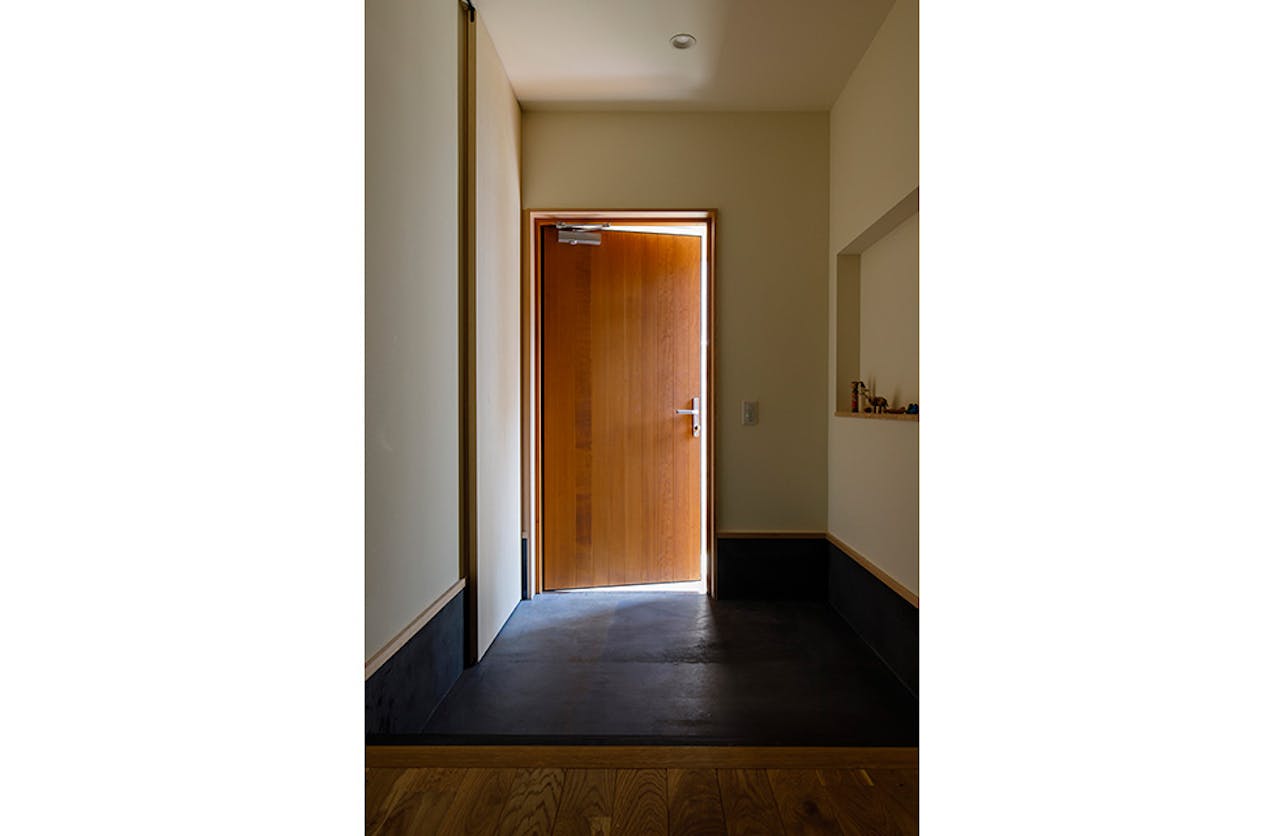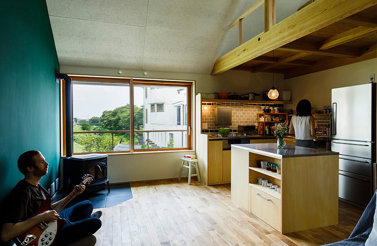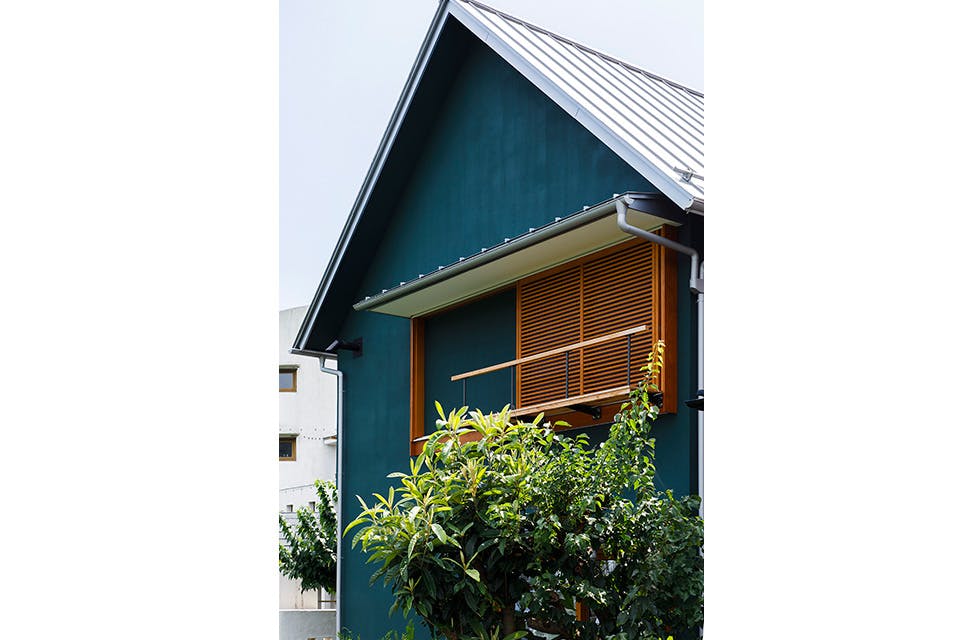 東京都内。幹線道路から少し入ったのどかな川沿いにある三角屋根の一軒家です。ガラリの網戸が印象的なその家は、すべての開口部を夢まどシリーズで統一しています。ブリティッシュグリーンの外壁に夢まどのフレームがアクセントを添える外観は、一見派手ですが、周囲の環境にしっかり溶け込んでいます。