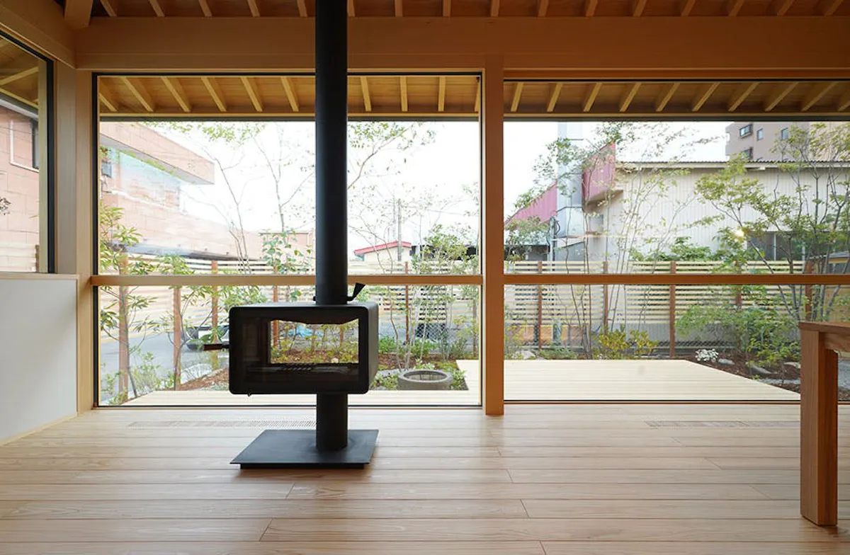 庭の景色を額縁のように切り取る、木製の大開口窓。まるで縁側に腰かけているような、内と外のつながりを感じられる設計です。薪ストーブのぬくもりと相まって、自然と暮らしがやわらかく調和します。